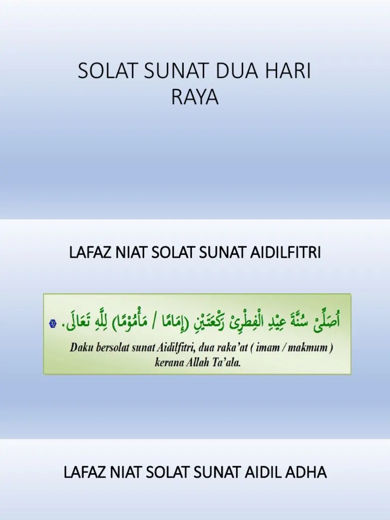 Dari segi bahasa, solat bermaksud doa. Sahaja aku solat sunat aidiladha, dua rakaat sebagai imam kerana allah ta'ala. Solat sunat aidil adha, terdiri daripada 4 perkataan yang digabungkan menjadi satu. Amalan sunnah pagi hari raya aidiladha. Sahaja aku solat sunat aidilfitri dua rakaat sebagai makmum kerana allah taala. ٩ ذو الحجة ١٤٤٢ هـ.